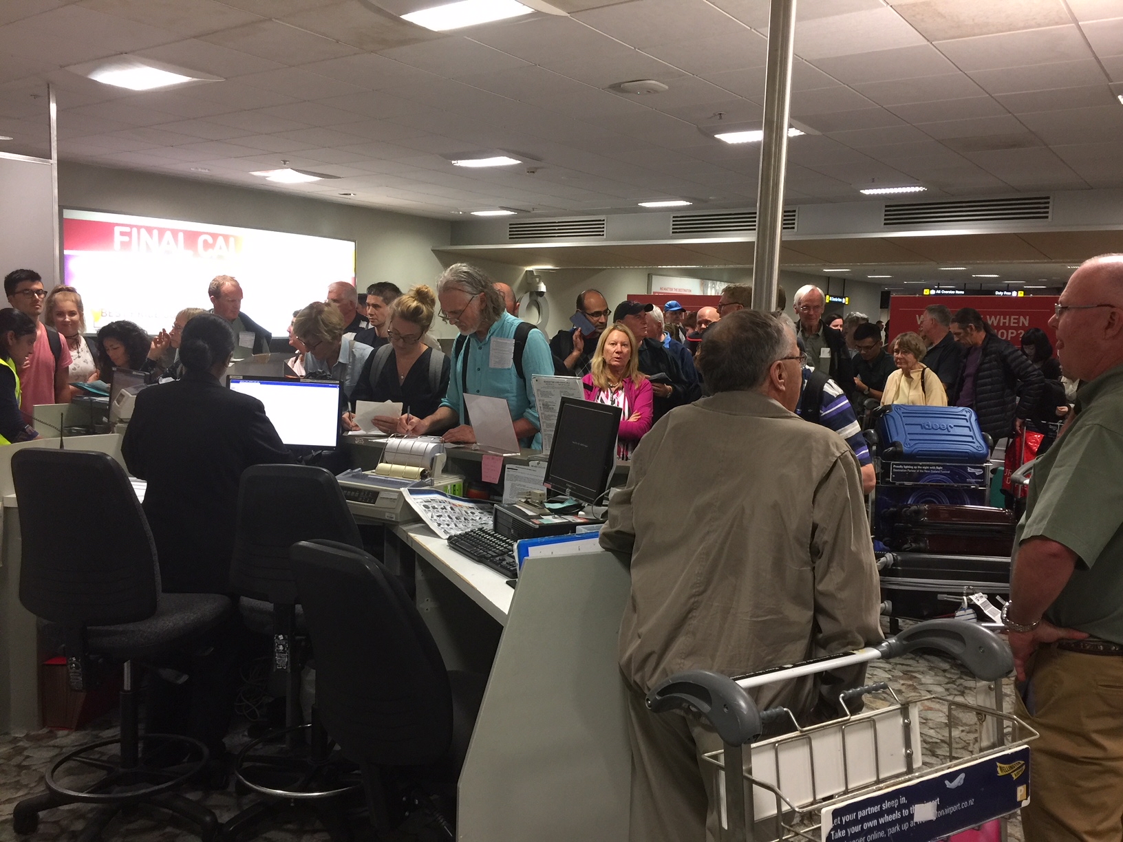 The queue of passagers from QF161 lodging lost luggage claims