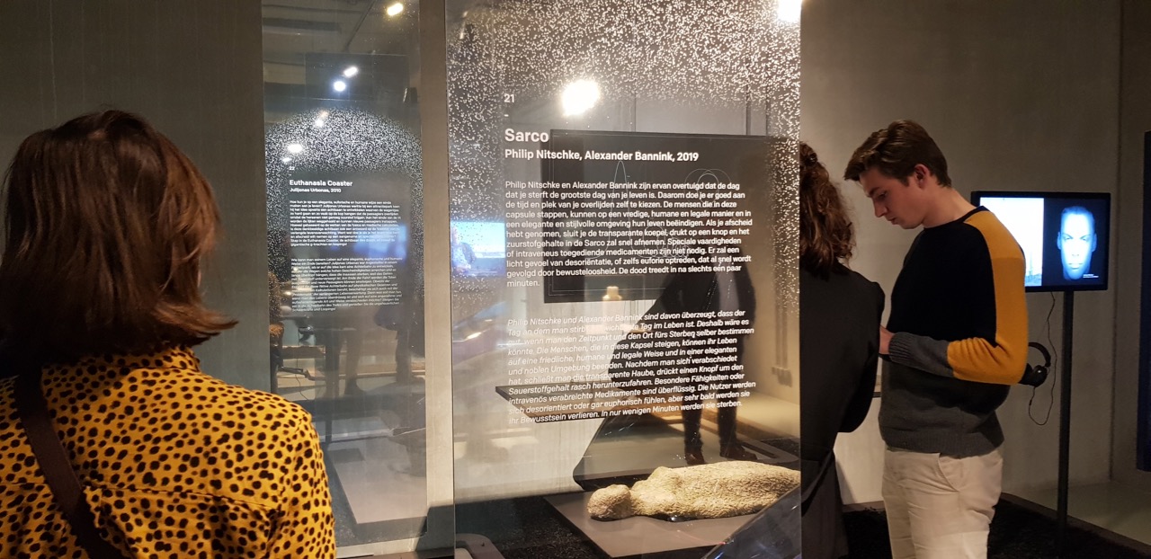 Sarco was on display in the exhibition ‘Verwacht: (Re)design Death’ which highlights ‘Dutch and international design projects related to death and the rituals surrounding it.’