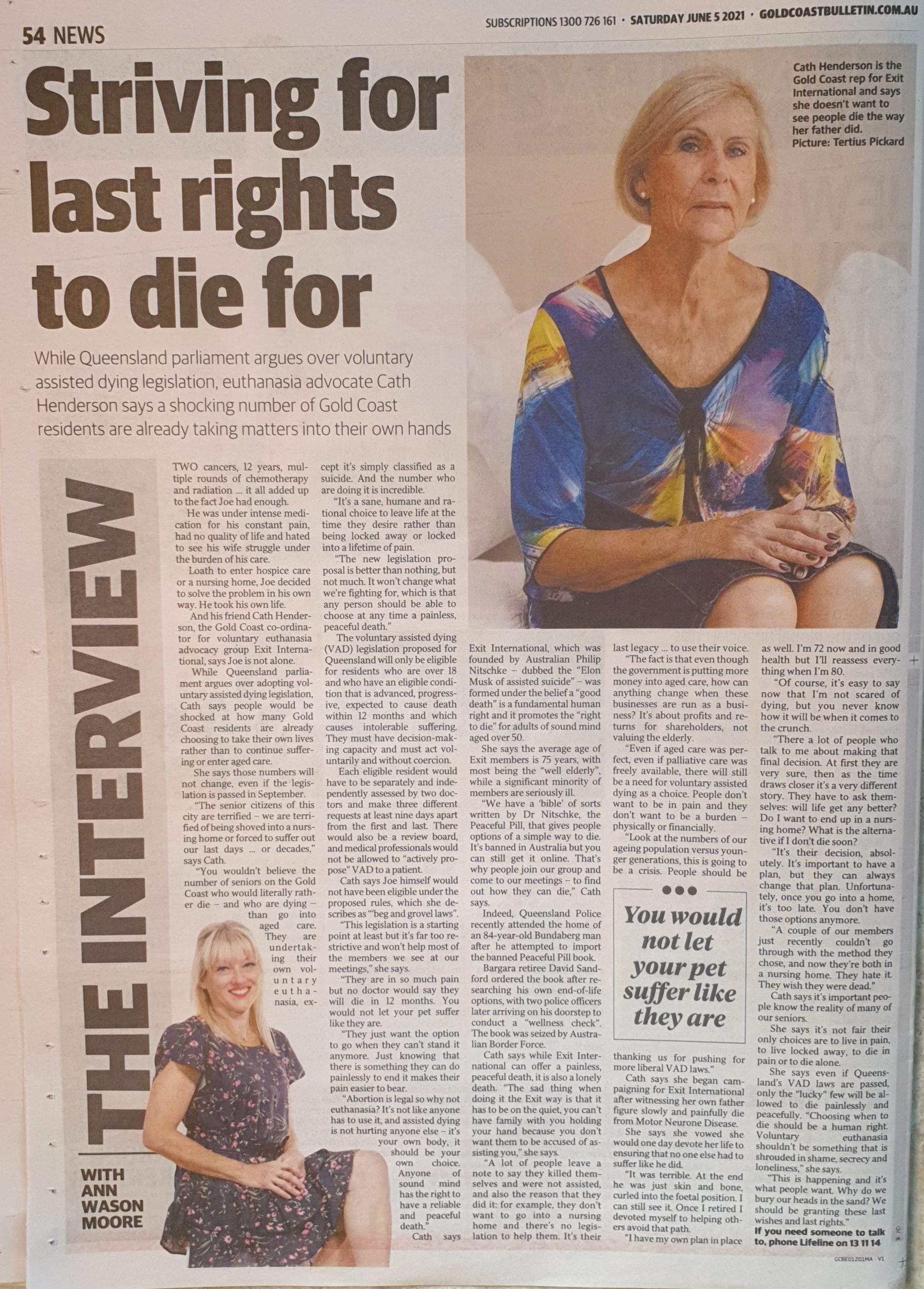 While Queensland Parliament argues over voluntary assisted dying legislation, euthanasia advocate Cath Henderson is striving for last rights to die for and says a shocking number of Gold Coast residents are already taking matters into their own hands.
